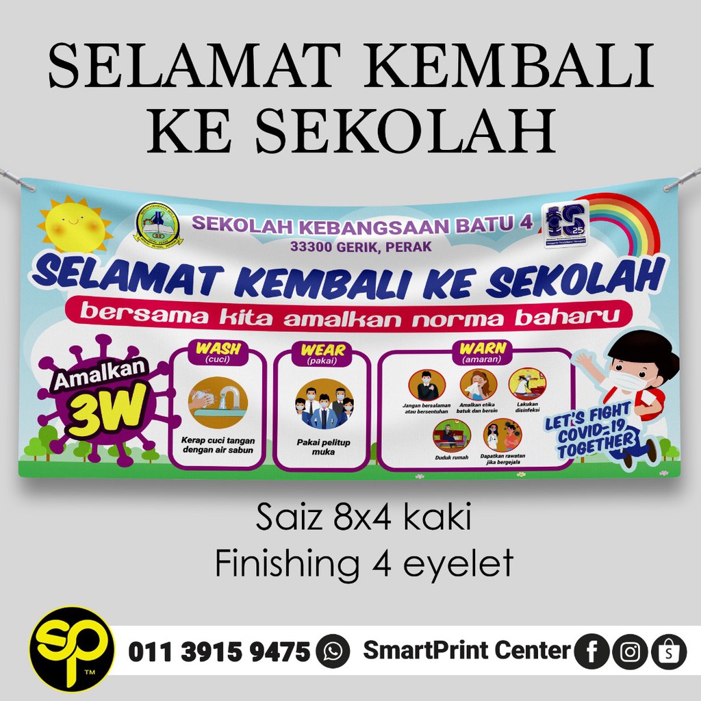 Selamat datang dan selamat kembali ke sekolah 2021. Banner program kesedaran pencegahan convid 19 saiz banner 8x4kaki finishing : You can also bookmark this page with the url :